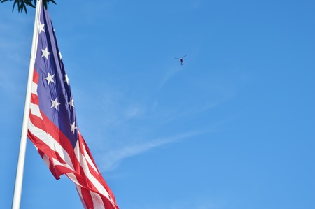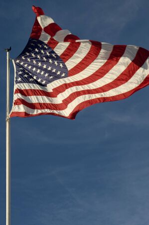 Isolated United States flag waving in the wind in a blue sky background. Copy space for text.