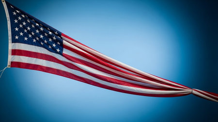 United States flag blows in the wind against a blue sky attached to the wall from the side