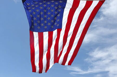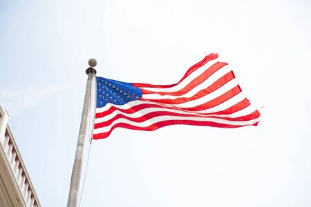 American flag waving in wind, USA. National symbol waves in breeze on flagpole. Real Old Glory Star Spangled Banner as concept of independence, liberty, democracy, patriotism. Background for 4th July.