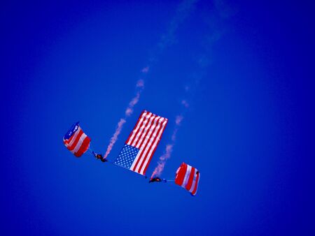 US American flag on blue sky background. For USA Memorial day, Veterans day, Labor day, or 4th of July celebration. Top view, copy space for text.