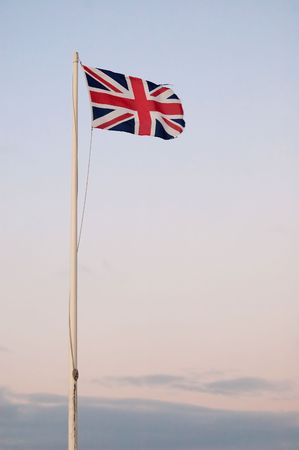 British flag or Union Jack flying from a flagpole against a white, overcast sky.