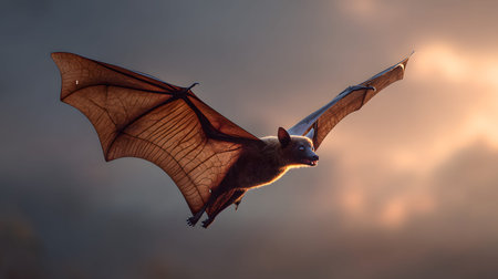 A cinematic macro shot captures a bat in mid-flight against a blurred forest backdrop. Warm colors enhance the mood, highlighting the bat's detailed wings and dynamic motion.