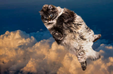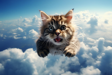 Generative AI Image of Brown Cat Jumping on the Clouds with Bright Blue Sky Background