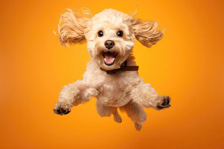 Very Happy Poodle Dog In Jumping, In Flight On Orange Background