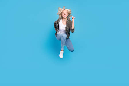 Full length body size photo woman jumping up overjoyed isolated pastel blue color background