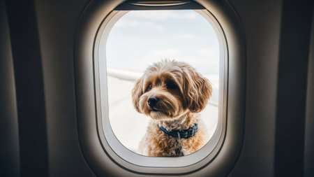 Cute dog looking out of the window of airplane. Traveling with pet concept.