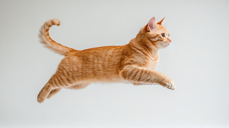 A lively orange cat leaps energetically in mid-air, showcasing its playful spirit and agility. Perfect for capturing the essence of feline fun and motion.
