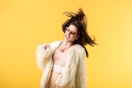 happy girl in faux fur jacket and sunglasses shaking head isolated on yellow