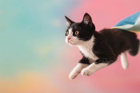 Superhero cat flying in gradient sky with space for text, ideal for creative designs