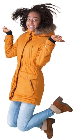 Happy kid wear red jacket. Lifestyle and People Concept. kid spring and fall fashion. full of energy. childhood happiness. teen girl jumping high in the sky. having a party fun