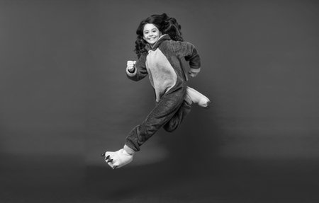 happy kid wear soft night suit. full length. child jump in cozy sleepwear. sweet dreams.