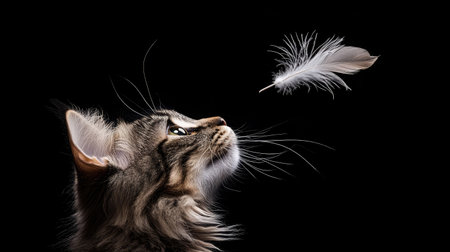 A stunning close-up of a cat gazing intently at a delicate feather against a black background, capturing the charm and curious nature of this majestic animal.