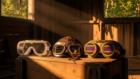 An ultrawide 16:9 cinematic shot capturing a nostalgic collection of old, protective play goggles (a