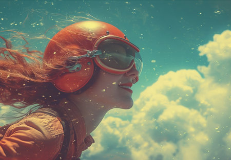 Aviator Girl, excited, flying above clouds in the sky. Generative AI image weber.