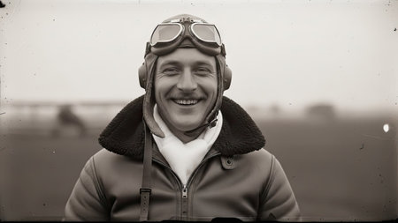 A monochrome portrait depicts a smiling pilot in classic attire. He wears goggles, a leather jacket, and a head covering, suggesting aviation. The photograph features a soft focus and a shallow depth of field, with a blurred outdoor backdrop. Suitable for historical, biographical, or illustrative uses.