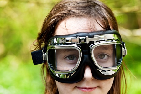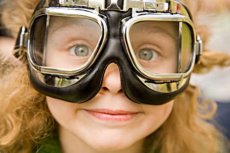 The ridiculous little girl with long hair and grey eyes in motorcycle glasses close up