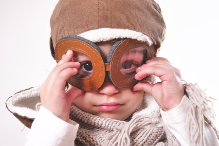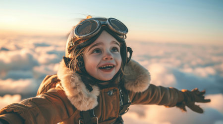 The side view of the picture that has the child flying into the bright sky with the aviator costume and the pair of goggles under the bright light of the bright sun with the happy smile face. AIGX03.
