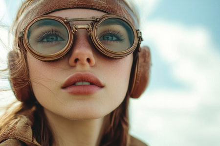 A woman stands outdoors, wearing vintage goggles and a brown jacket, looking thoughtfully at the sky.