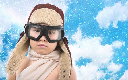 A pilot boy is wearing an old blue jeans jacket and hand gloves on a heavy winter day. A happy kid in a pilot costume and goggles. Close-up view on rustic damaged wall background.