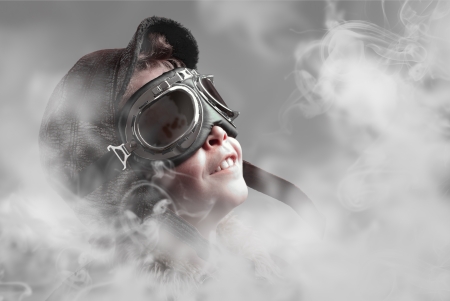 Boy pilot smiling into smoke