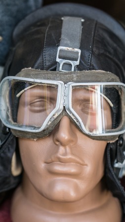closeup shot of dummy man head with old vintage retro aircraft pilot leather flight helmet and goggles mask