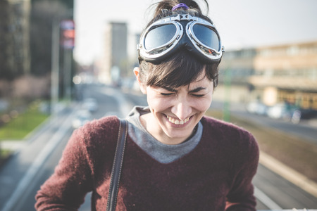happy butch girl in retro pilot glasses over grey background