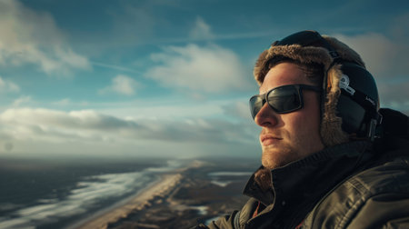 Pilot with a concentrated expression as he prepares to take off from a hill overlooking the beach. generative ai