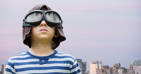 Digital composite of Boy with goggles against buildings and evening sky