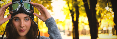 A young woman stands outdoors, showcasing vintage aviator goggles and leather ear protection.