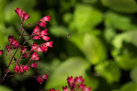 Small flying wasp is going to land on small flower. Macro photography, green smooth background, wasp caught in fly.