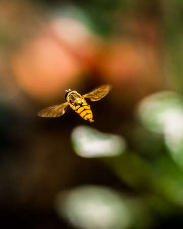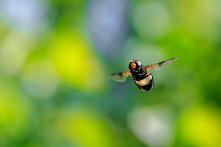 Beautiful Hoverfly or flower fly, sweat bee or syrphid fly in mid-air against a green background