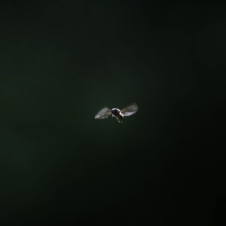 A portrait of a bee hovering in the air looking around for a place to find some nectar to collect and make honey. The insect is flying in front of a dark background.