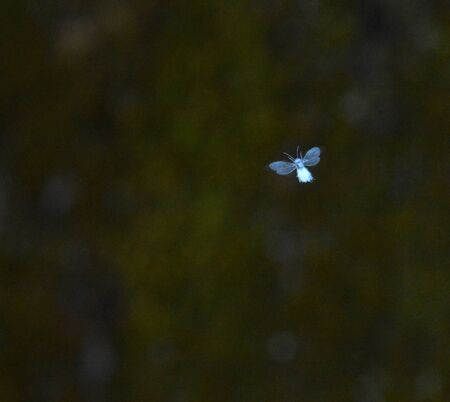 A bee fly (Bombylius major, Bombyliidae) in flight on a sunny day in spring (Vienna, Austria)
