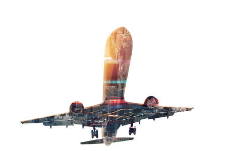 Airplane taking off, bottom view - Travel by aircraft. Air transport concept with empty space for text