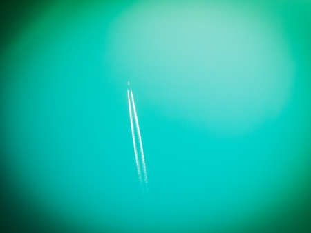 Wallpaper background of an airplane trace in the blue sky. Vignette effect.