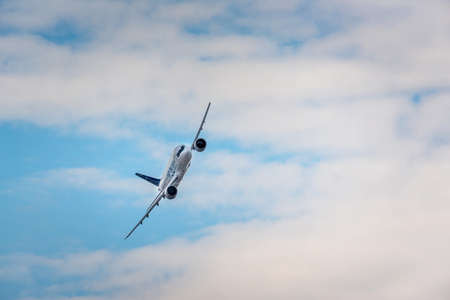 Moscow, Russia - 07 25 2021: The Irkut MC-21 300, Russia's newest passenger aircraft test plane performs a hard right bank in a demo flight at the International Aviation and Space Salon MAKS 2021