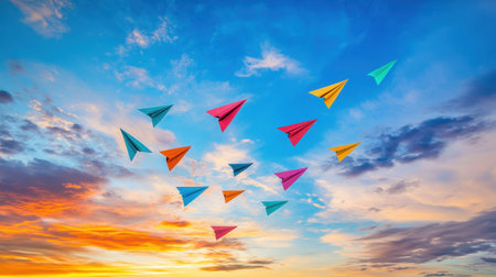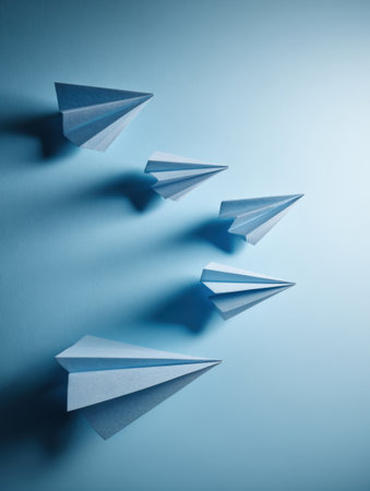 Several yellow airplanes flying across deep blue sky in different directions symbolizing confusion and danger