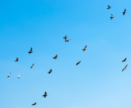 Flock Of Doves Flying In Blue Sunny Sky. Freedom Peace
