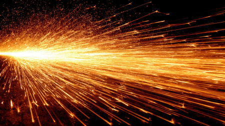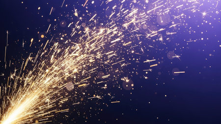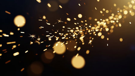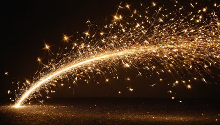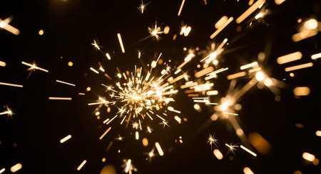 Radiating golden sparks fanning out in dark space, with sparkler creating star-shaped bokeh lights. Dynamic, abstract, vibrant, celebration, illumination, cosmic, energetic