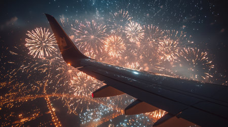 Colorful fireworks burst in the night sky above a vibrant city, viewed from the wing of an airplane. The dazzling lights create a festive atmosphere, enhancing the travel experience.