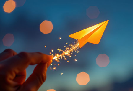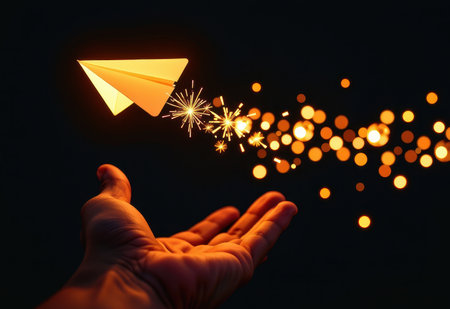 A hand releases a paper airplane with a trail of sparkling light following it symbolizing dreams aspirations and the pursuit of goals.