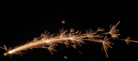 Close-up image capturing the bright sparks of a lit sparkler against a night backdrop