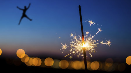 A vivid image of a sparkler creating bright, sparkling trails against the dark night sky. A silhouette of a person appears to be jumping in the background, adding to the sense of joy and celebration. The scene is illuminated by the sparkler's light, with bokeh effects from distant lights enhancing the festive atmosphere.