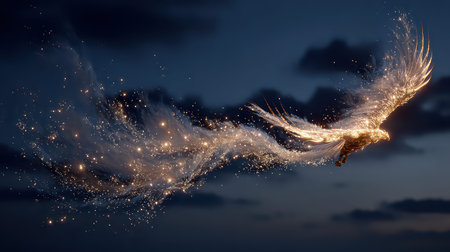 An ethereal eagle glides through a starry night sky, leaving a trail of shimmering magic. This captivating image embodies freedom, beauty, and nature