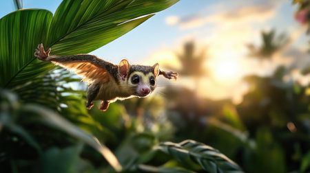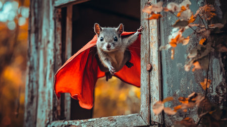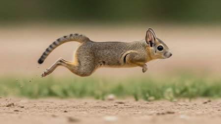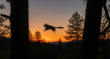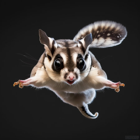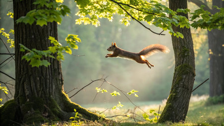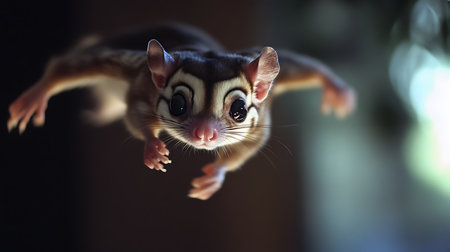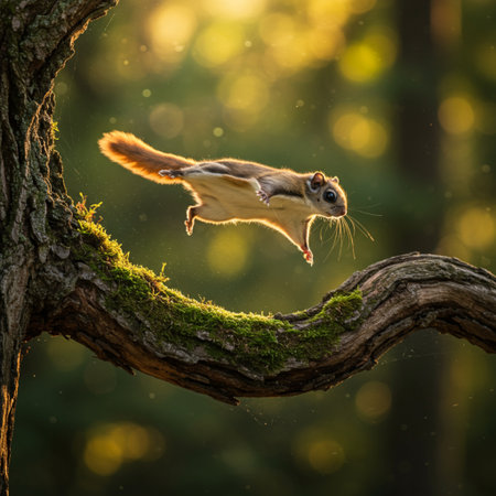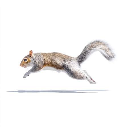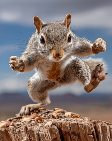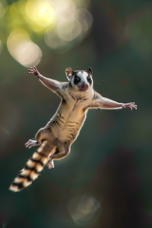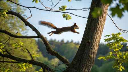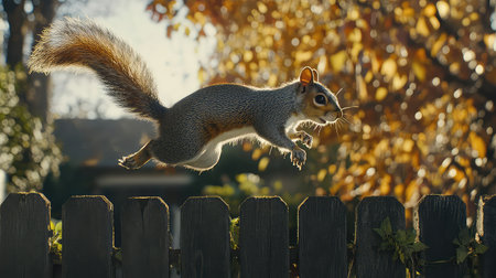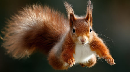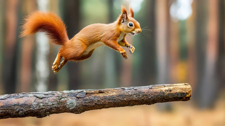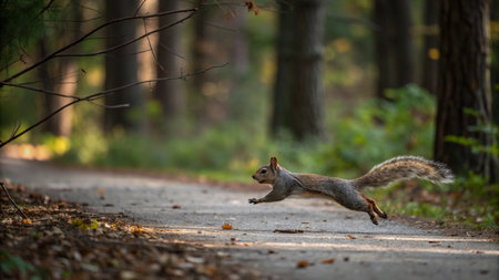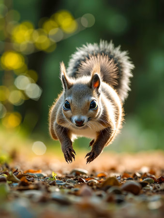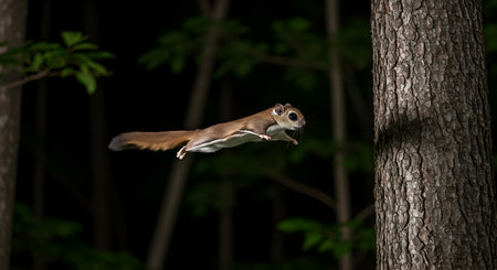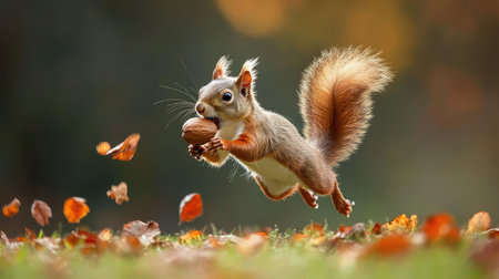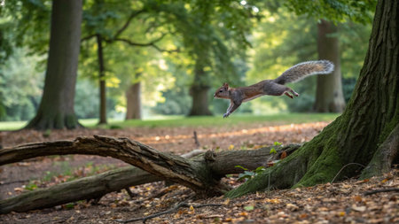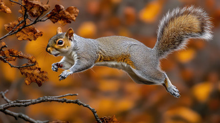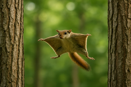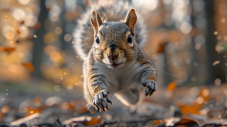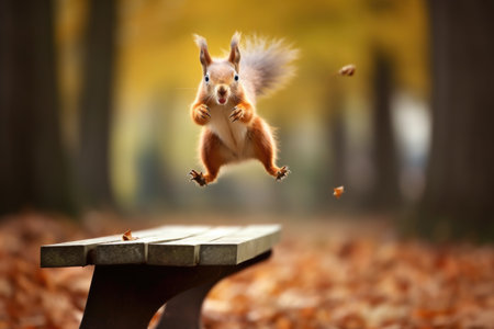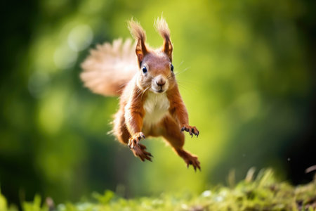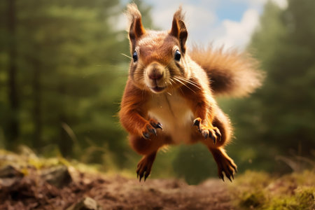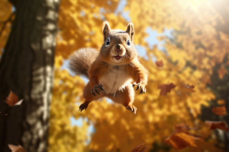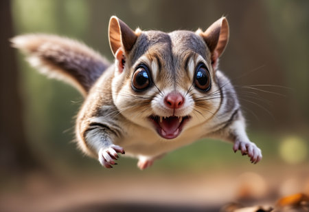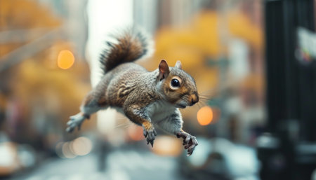 A squirrel flying through the air with blurred background, AI