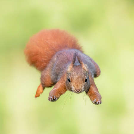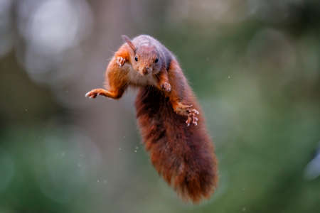 Red Squirrel Jumping. Cute Eurasian red squirrel (Sciurus vulgaris) jumps out of a tree in the forest of Noord Brabant in the Netherlands. green background.