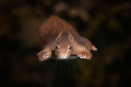 Cute Eurasian red squirrel (Sciurus vulgaris) jumps out of a tree. Tessenderlo, Belgium. Black background.