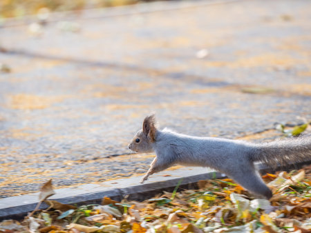 Squirrel quickly runs through the autumn park. Squirrel with large bushy tail leaping through golden autumn