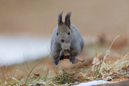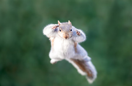 Close-up of a grey squirrel jumping, UK.
