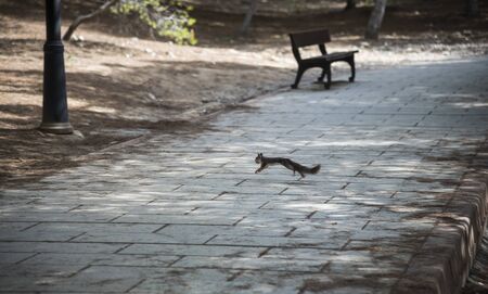 Squirrel running on the road in the forest. Autumn season.